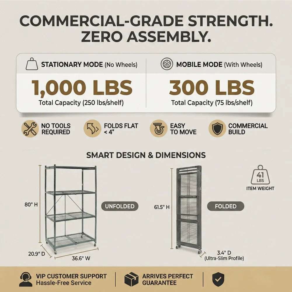 100% pre-assembled design—just unfold in seconds. Supports 250 lbs per shelf, making it the fastest way to organize your garage or pantry.
